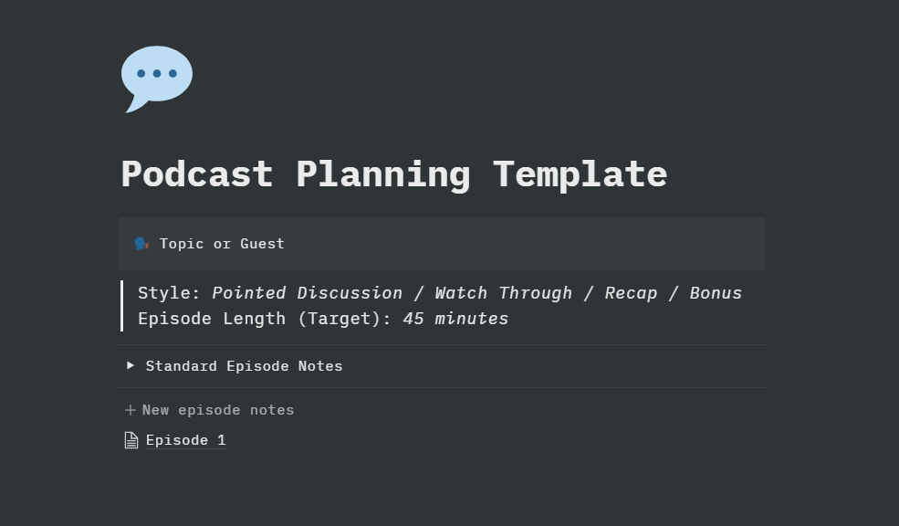 A Notion template for podcasts! Keep track of show notes, your show's type, and standard run time.